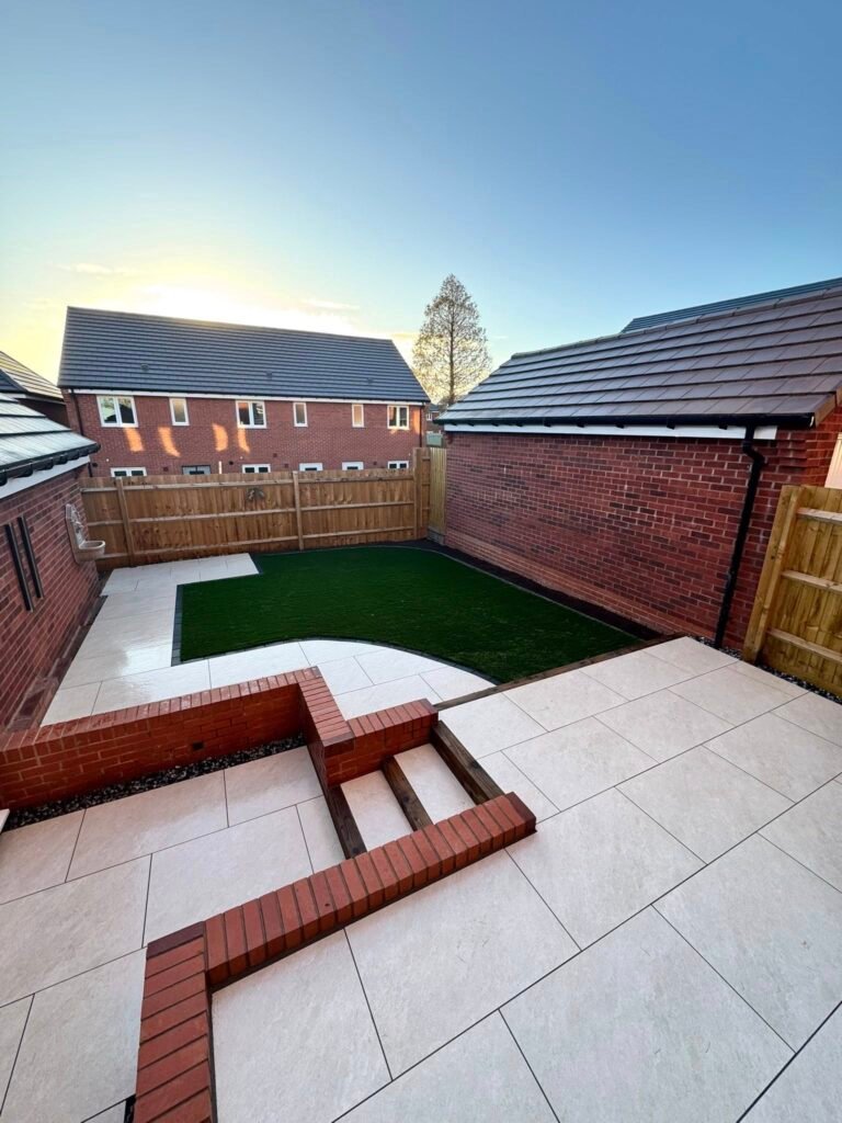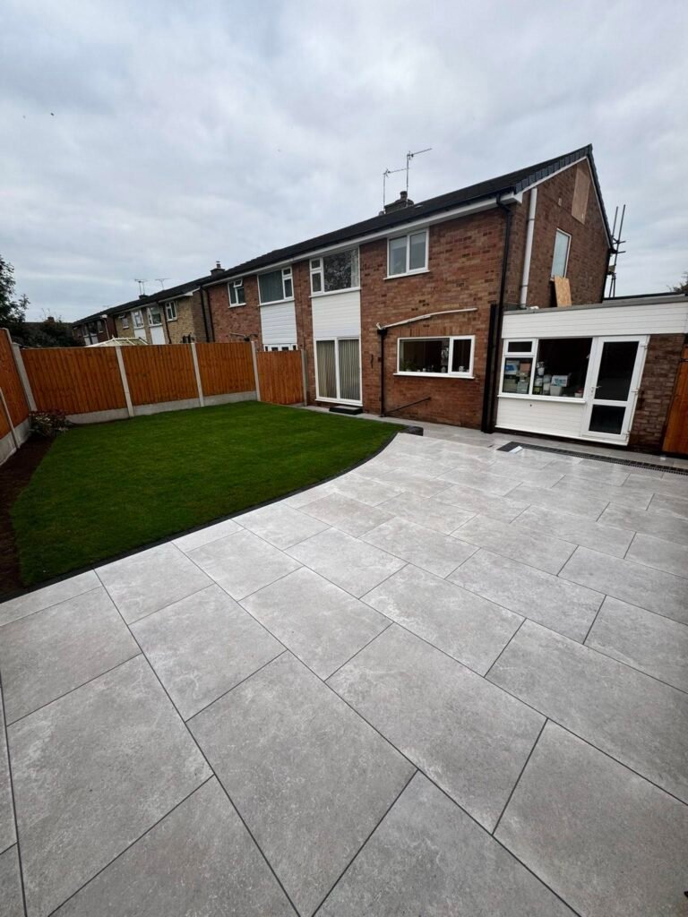 High-quality patio installations using porcelain or traditional paving for durable, stylish outdoor living areas.